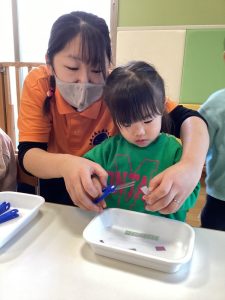 👩🏫「今回はハサミを使います✂️まずは先生と一緒に折り紙を切ってみようね❗️」