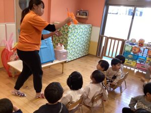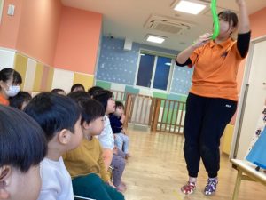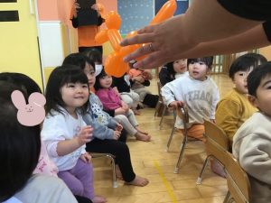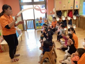 次は先生がオレンジ色の細長い風船をくる、くる、くるくるくる🌀