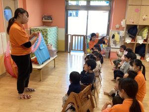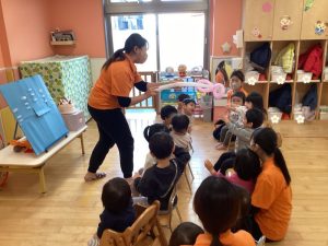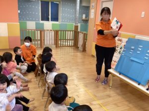 絵本「ぜったいにおしちゃダメ?ラリーのたんじょうびケーキ」の読み聞かせからスタートしました📚