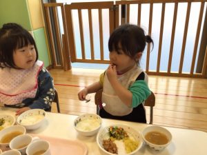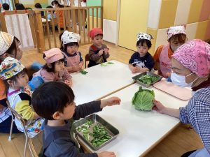 給食では自分達でちぎったキャベツが入っているかどうか、お皿の中をじっと眺めるりんご組さん🍎👀