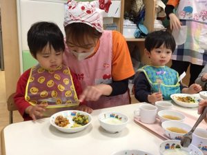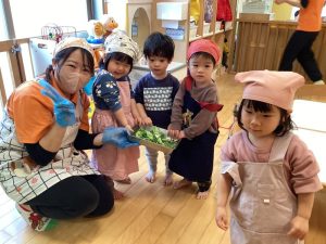 「りんご組さんがちぎってくれたキャベツが入っているよ❣️」と伝えるともも組さん🍑といちご組さん🍓もとても美味しそうに食べていました💓