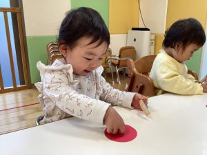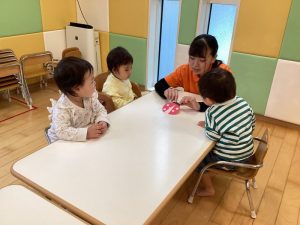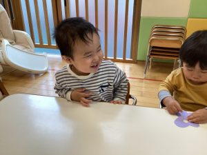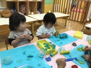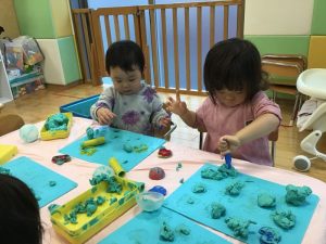 粘土遊びでは、手先を上手に使ってコロコロしたり、押したり感触遊びを楽しんでいます🎶