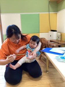 先生のお膝がいいよ〜と教えてくれたので、椅子ではなく抱っこでチャレンジです😊✨