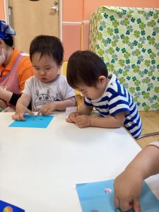 👦🏻「くすぐったいな〜😯」そんな表情をしながら先生と一緒に塗っていきました🎨✨✨」