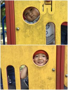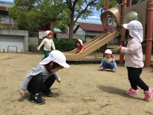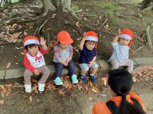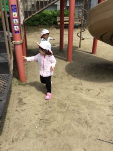 この日は、同じオレンジ色の帽子をかぶった近隣の保育園のお友達がいたので帽子を裏返して白色にしてから遊びました💭