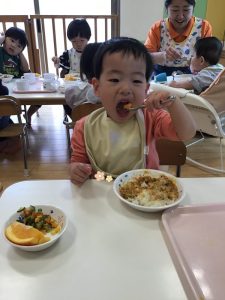大好きなカレー💗にデザートのオレンジ🍊も付いていて「😆やったー‼️おかわりもある?」と大喜びです‼️‼️