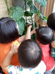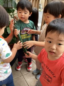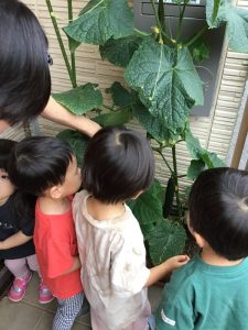 エントランスのプランターで育てていたきゅうりが大きくなったのでりんご組さんで収穫をしました🥒✨