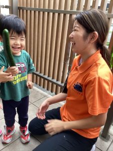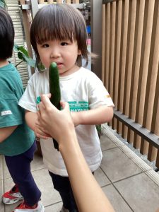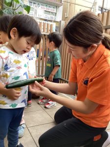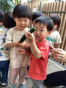 子どもたちの顔よりも大きく育ったきゅうりに「すごーい!重たいよ〜✨」と嬉しそうな様子でした😊❣️