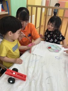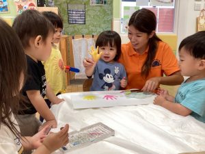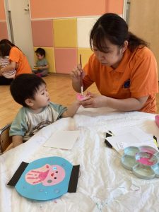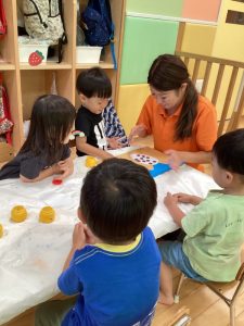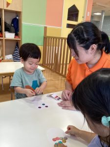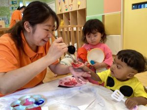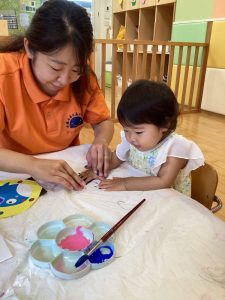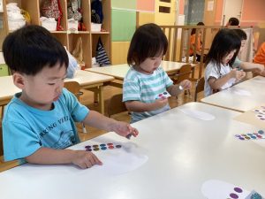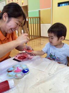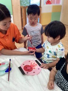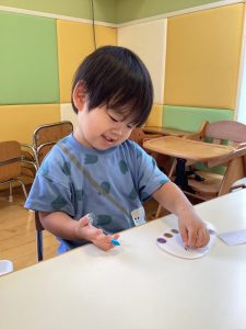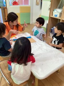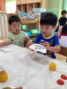 お友達に見守られながら絵の具をぬりぬり🎨🖌️