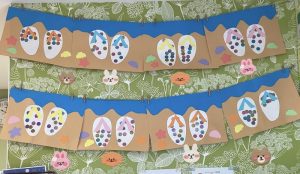 サンダル🩴の形をした画用紙にシールを貼っています🔴🔵🟣🟠