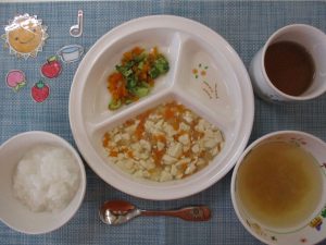 今日は、新メニューの厚揚げと野菜のケチャップ煮でした。少し苦手なグリーンピースも大好きなケチャップ味がついていたので、パクリ♪と食べていました。