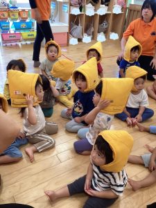 それからみんなで防災頭巾を被る練習を行いました❗️