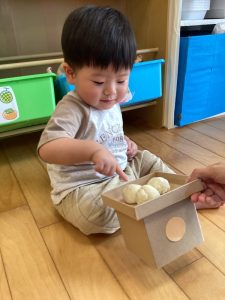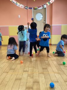 沢山のボールをノンタンの玉入れ箱に入れていきます❣️