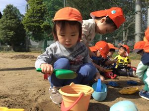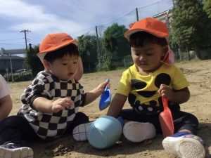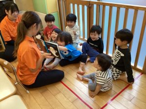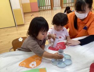もも組さんのお友達は隣同士に座って一緒に遊びを楽しんでいました💕