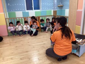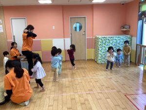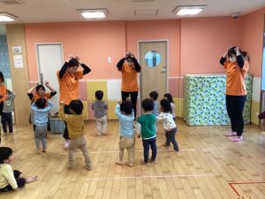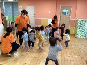 いちご組、もも組のお友達もりんご組さんと一緒に取り組んでいます😌🌟この後はハンドサインをしたり、カスタネットを使って「あわてんぼうのサンタクロース」も歌いました😆