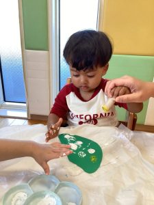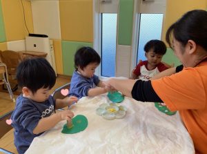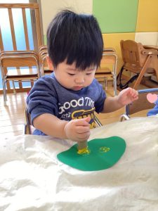絵の具を使いスタンプして、絵柄をつけます💚💛