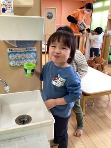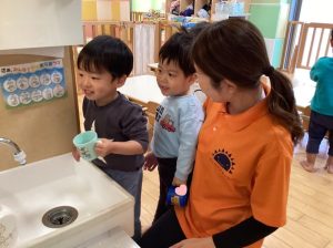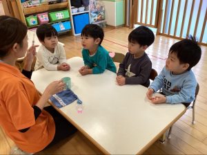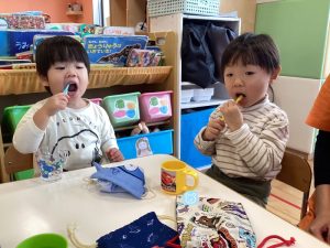 👩‍🏫「口の中をゆすいだら順番でお友達と交換こしようね🎶」など先生のお話をしっかりと頷きながら聞いてくれましたよ🙂‍↕️