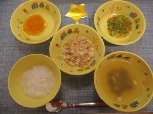 (写真は後期食です。月齢によって形、固さ、盛り付け量を変えて提供しています。)