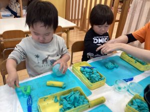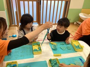 自分で粘土玩具を使って切ったり伸ばしたり丸めたり👏