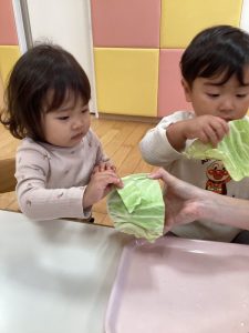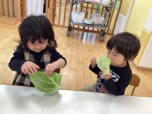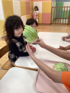 みんながキャベツに興味を持ってくれたところで実際に手に取ってじっくりと観察をしてみます👀