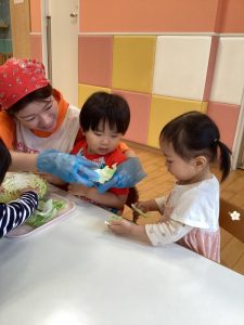 観察の後はキャベツの葉をちぎってみます✨