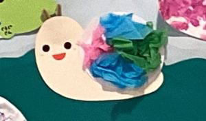 カタツムリの甲羅にくしゃくしゃにした花紙を貼りました💓