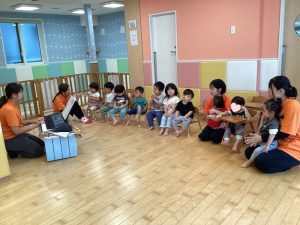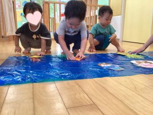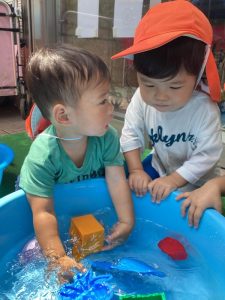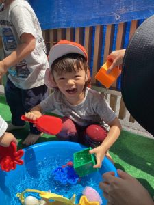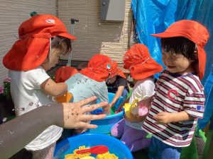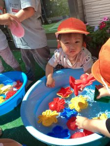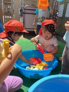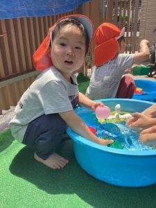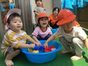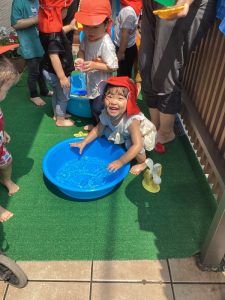 都賀園ではタライに水を入れて、その周りで水遊びを楽しみます✨