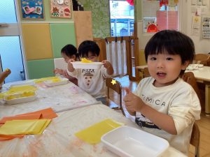 黄色🟡とオレンジ🧡丸めたら、紙皿に貼るからね〜👍✨