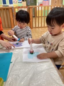 🖐️色が混ざる変化を目で楽しみながら、ポンポンとスタンプをしました🎵