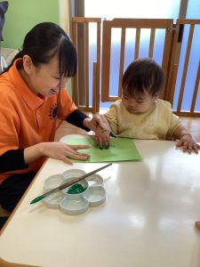 手形で門松を作ります!手のひらに絵の具を塗ってもらうと「わ‼️」と冷たいことにびっくり🫢💦