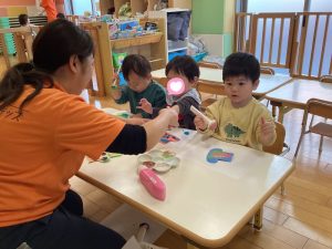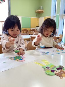 🧐どこを塗ろうかな❔ここかな❔と考えながらする子や勢いよくスタンプする子など様々でみんな思い思いに作っています🎶