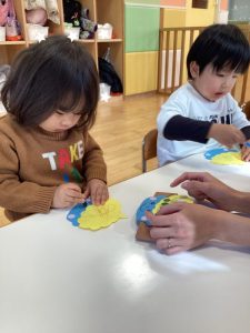 👩🏻先生の見本と自分の鬼さんを見比べながら真剣な表情で取り組んでいました‼️