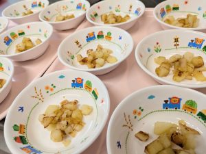 給食が始まる前に「今日は、お魚かな?お肉かな?」とお友達同士、会話をしている可愛らしい姿が見られました♪