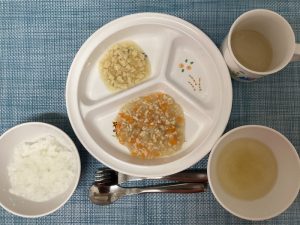 (写真は後期食です。月齢によって形、固さ、盛り付け量を変えて提供しています。)