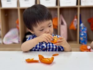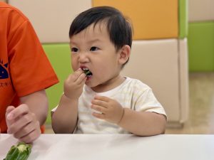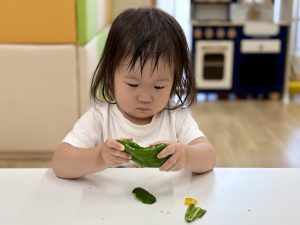食育として、匂いをかいだり、ちぎったり、かじってみたり、