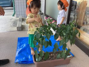 みんなで水やりをして大切に育てたお陰で可愛らしいピーマンが育ち、収穫しました。