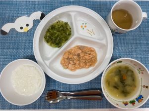 今日は、具だくさんなお味噌汁と鮭の塩焼き、ブロリーのごま和えと和食のメニューでした。子どもたちは、和食も好んでよく食べてくれます。「しゃけのおかわりくださ~い」とお魚もたくさん食べました♪
