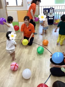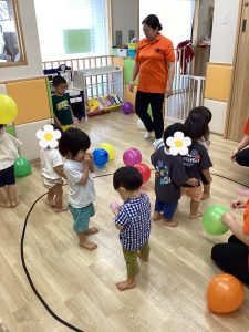 小さい風船、大きい風船、たくさん出して、追いかけたりポンポン上にとばしたり