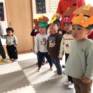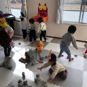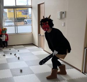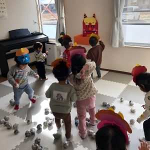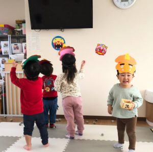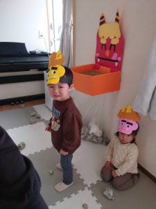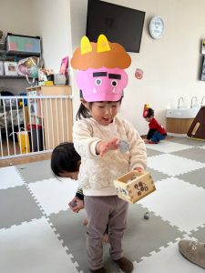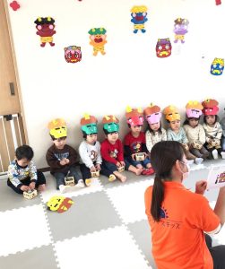 前日に、お家で家族の方と豆まきをしたお友達がたくさんいて「鬼はーそとー!」「福はうちー!」のかけ声も上手でした🎵