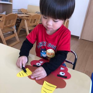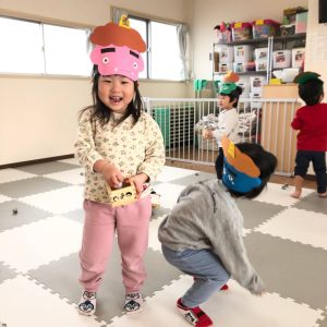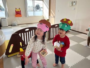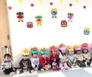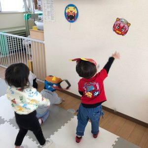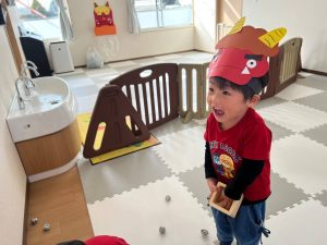 前日に、お家で家族の方と豆まきをしたお友達がたくさんいて「鬼はーそとー!」「福はうちー!」のかけ声も上手でした🎵