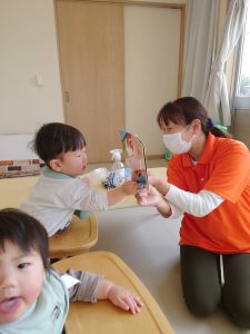 お花やベットの中から動物さんが出てきたり、先生が「おはよう」と元気に声をかけると、みんなもニコッと笑ったり手を上げてくれました☺️