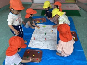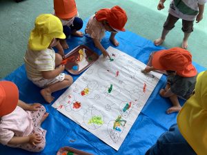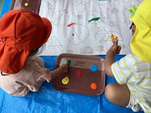大好きなてんとう虫や蝶に色をつけたくて、いろんな色を使って指スタンプに集中して、感触も楽しんでいました🎨