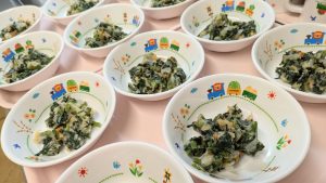 (写真は後期食です。月齢によって形、固さ、盛り付け量を変えて提供しています。)