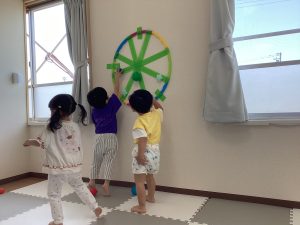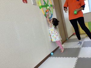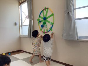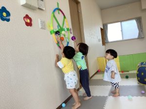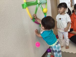 先生が的を作ると、つかまり立ちをするももぐみのお友達も興味津々で触れていました🎯