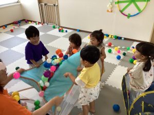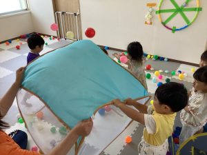 だんだん盛り上がり、ボールプールを逆さまにしてボールを集め、大波小波が始まると、大きな笑い声が響いていました😄😆😃