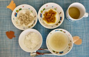 (写真は後期食です。月齢によって形、固さ、盛り付け量を変えて提供しています。)