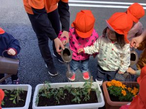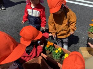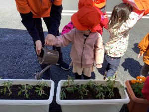今週はじめに、りんご組さんが先生と一緒にプランターに下石を敷き、土を入れ、トマト?の苗とマリーゴールド?の苗を植えつけました。
