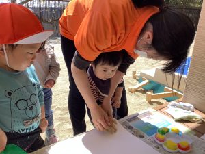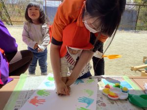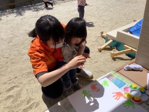 こども達は、同じ経験の中で、絵具の感触を知ったり、自分の感情を保育士に表現したり、いろいろな色を見ることで脳を刺激したり、また一つ面白い遊びを見つけました。