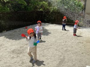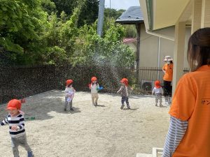 暑い日には園庭でシャワー?のトンネルをしました。