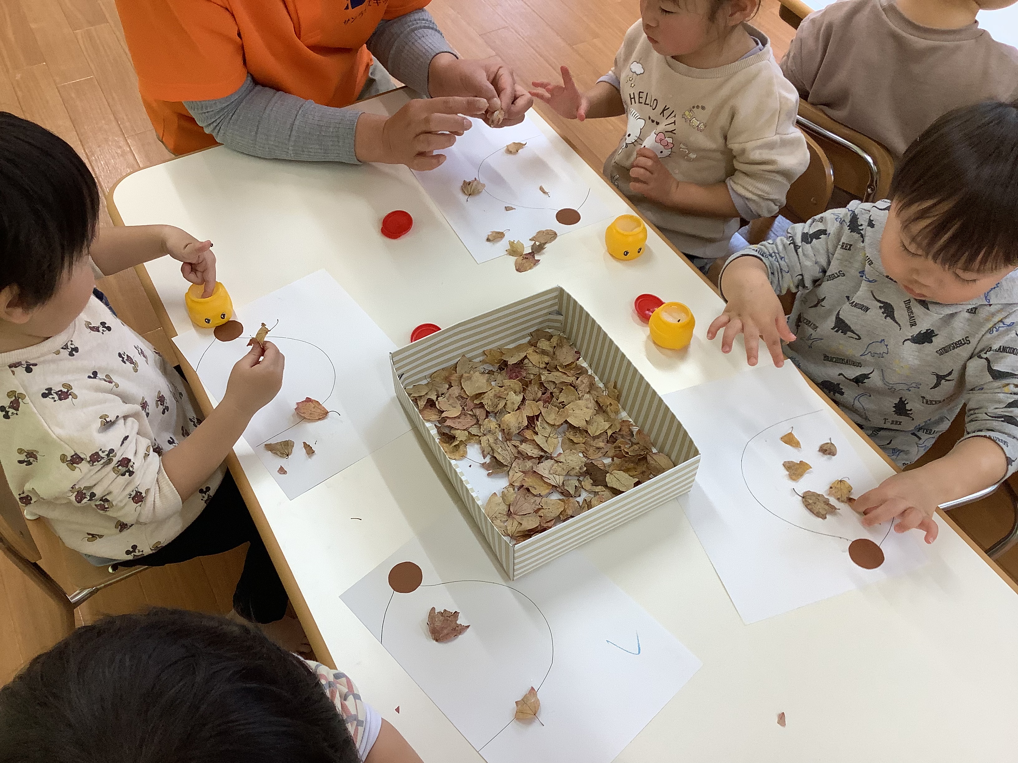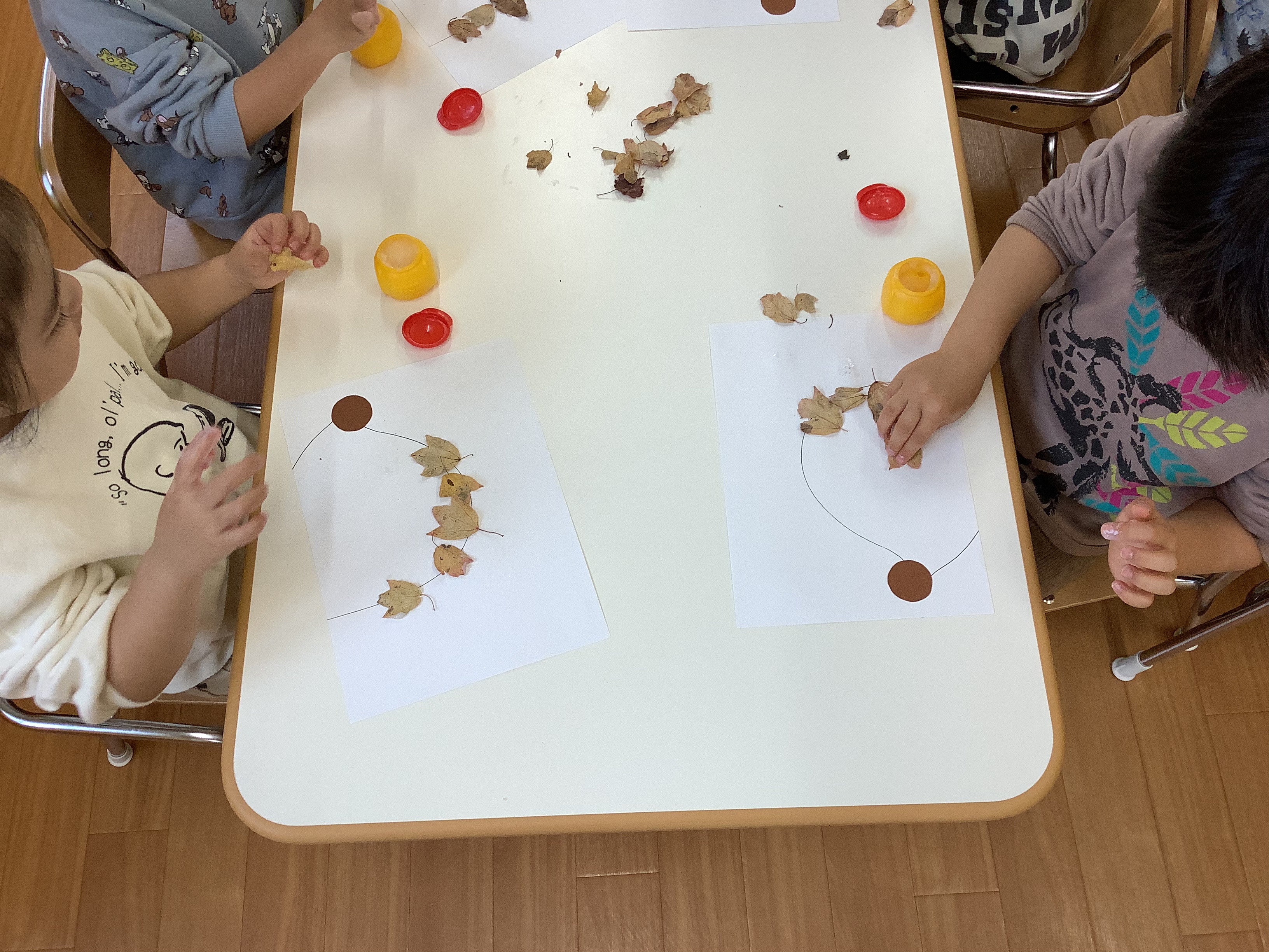 のりの中に葉っぱを入れてグルグルして貼り付けている子もいました。